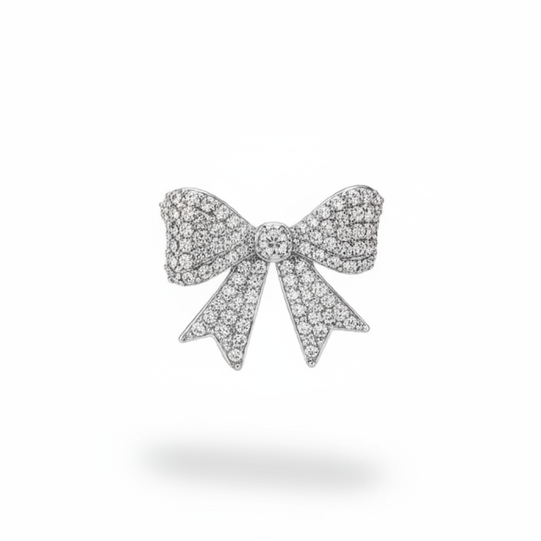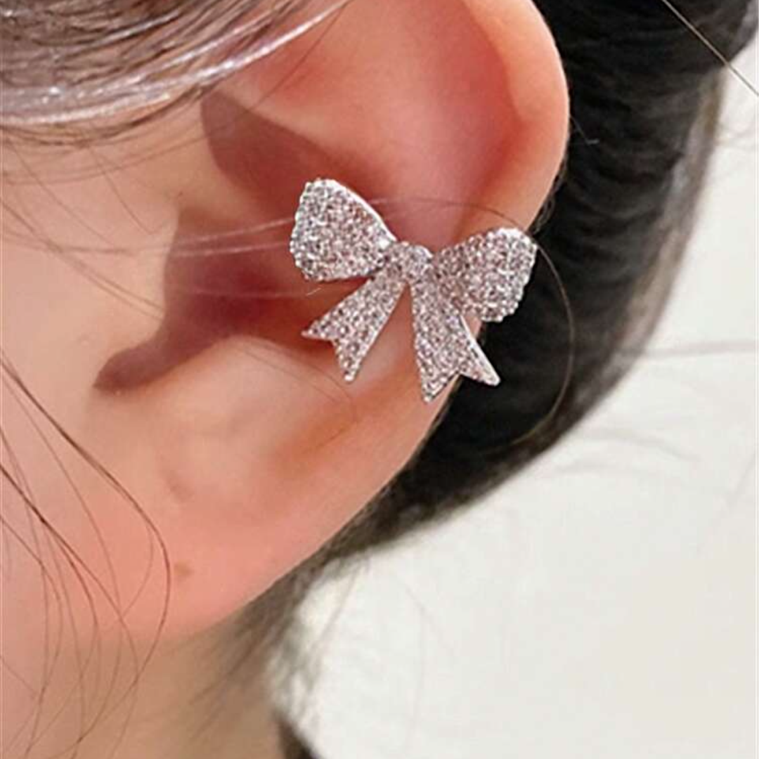 Diamond Bow Ear Cuff, No piercing? No Problem. Our ear cuff attaches to the outside of your ear and can be placed anywhere from the middle/lower section of the ear to the top of the ear. Simply squeeze the cuff to make tighter on the ear or open for a looser fit.